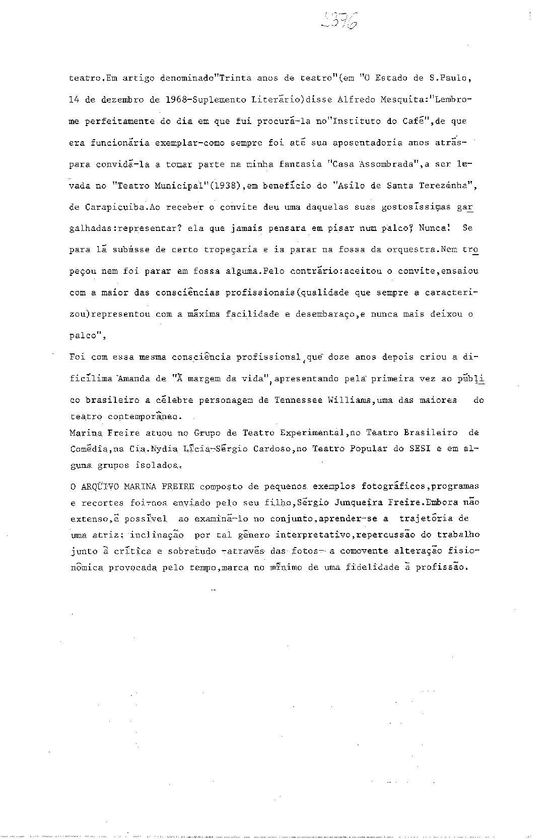 ARQUIVO MARINA FREIRE FRANCO (MARINA FREIRE) 1938 – 1971 Voltar Documento 1376 Baixar Anexos 1376 verso DESCRIÇÃO Miniatura Compartilhe TÍTULOARQUIVO MARINA FREIRE FRANCO (MARINA FREIRE) 1938 - 1971ANO DO EVENTONÃO SE APLICADESCRITIVO / ASSUNTOSDOCUMENTAÇÃONÚMERO DO PACOTE1376EQUIPE TÉCNICAAC - ARTES CÊNICASLISTAGEM DE MATERIAISConvite: 661 à 665 Documento Textual: 3815 à 3825 Folheto: 840 Foto Publicitária: 4777 à 4793 Fotografia: 98254 à 98329 Matéria Jornalística: 5462 à 5514 Continuar navegando MORTE E A DONZELA, A TEATRO DE ARENA 1957/1975 Voltar para a lista de itens