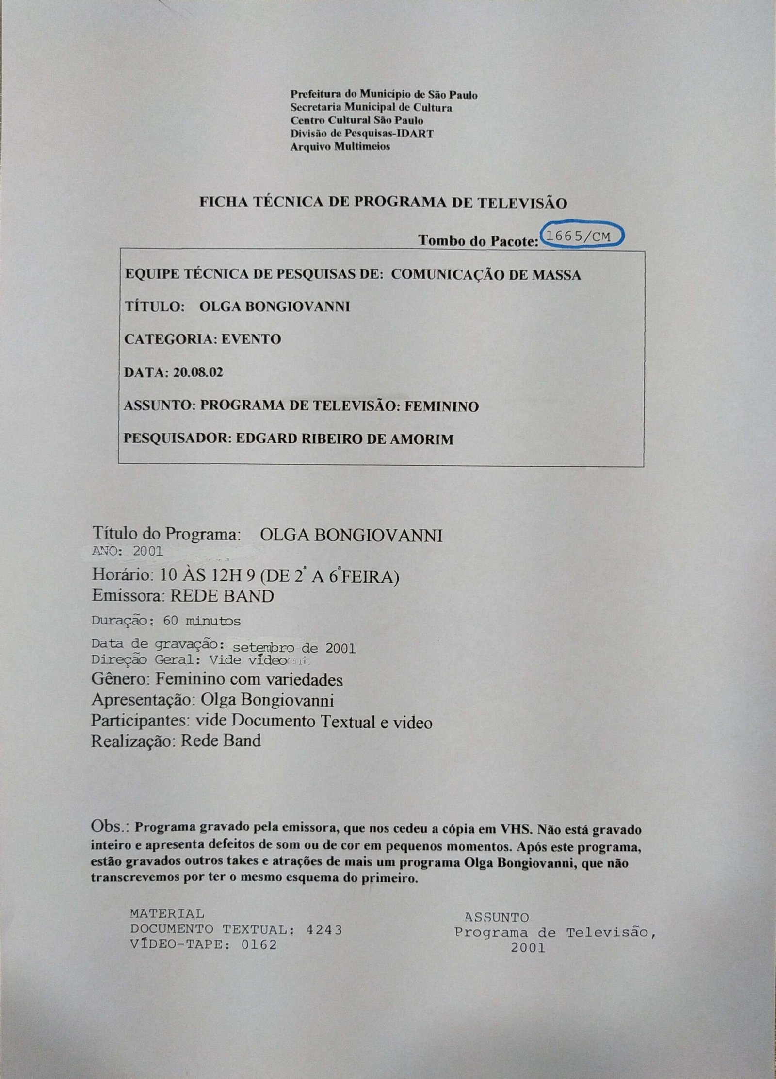 OLGA BONGIOVANNI Voltar Documento 1665 Baixar DESCRIÇÃO Miniatura Compartilhe TÍTULOOLGA BONGIOVANNIANO DO EVENTO2001DESCRITIVO / ASSUNTOSPROGRAMA DE TELEVISÃONÚMERO DO PACOTE1665EQUIPE TÉCNICACM - COMUNICAÇÃO DE MASSALISTAGEM DE MATERIAISDOCUMENTO TEXTUAL DT 4243 VIDEOTAPE VT 0162 Continuar navegando FICA COMIGO COISAS DE CRIANÇA NA TV Voltar para a lista de itens