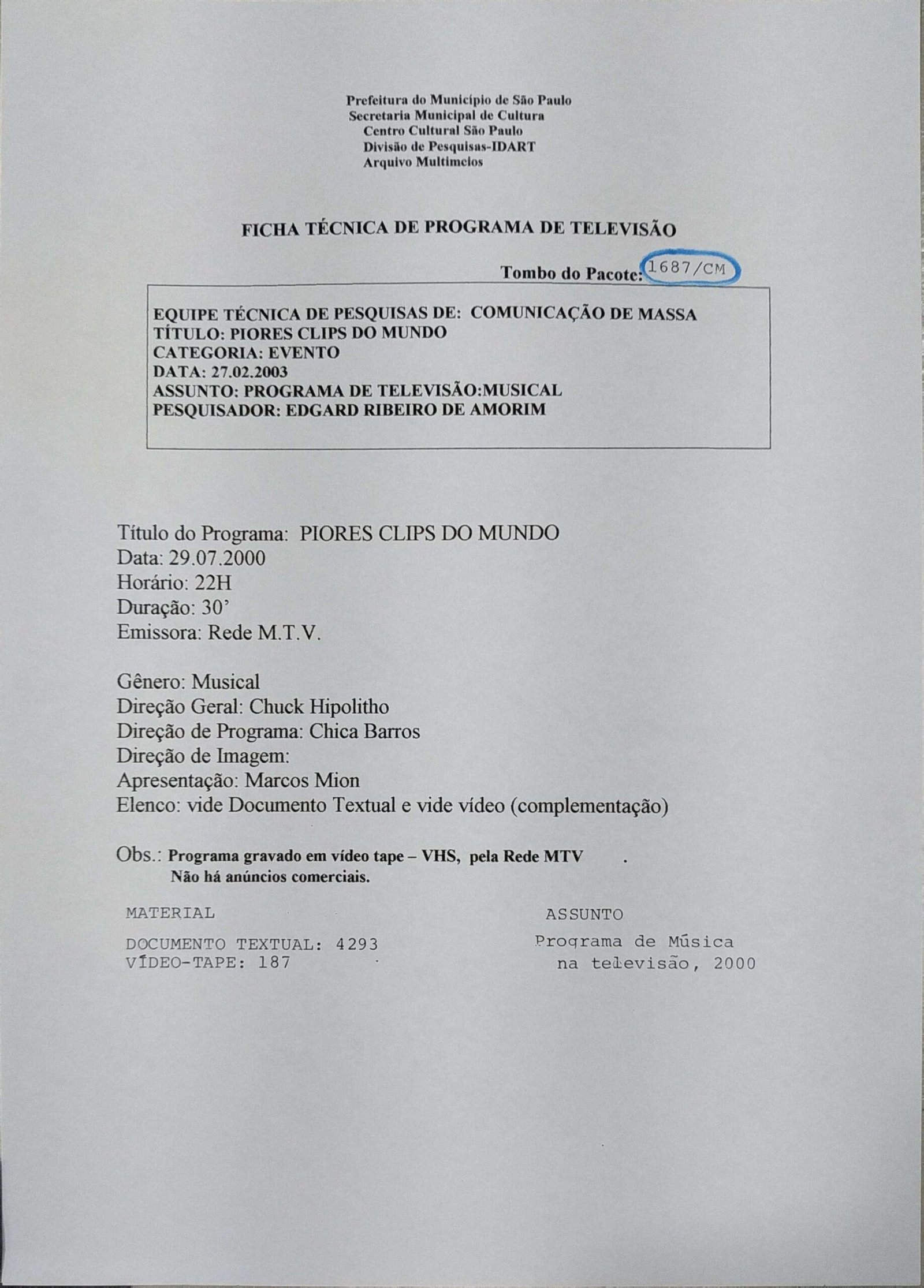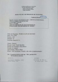 PIORES CLIPS DO MUNDO Voltar Documento 1687 Baixar DESCRIÇÃO Miniatura Compartilhe TÍTULOPIORES CLIPS DO MUNDOANO DO EVENTO2000DESCRITIVO / ASSUNTOSPROGRAMA DE TELEVISÃONÚMERO DO PACOTE1687EQUIPE TÉCNICACM - COMUNICAÇÃO DE MASSALISTAGEM DE MATERIAISDOCUMENTO TEXTUAL DT 4293 VIDEOTAPE VT 0187 Continuar navegando BARRACO MTV TODOS CONTRA UM Voltar para a lista de itens