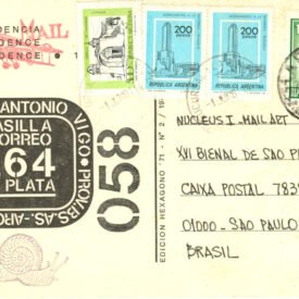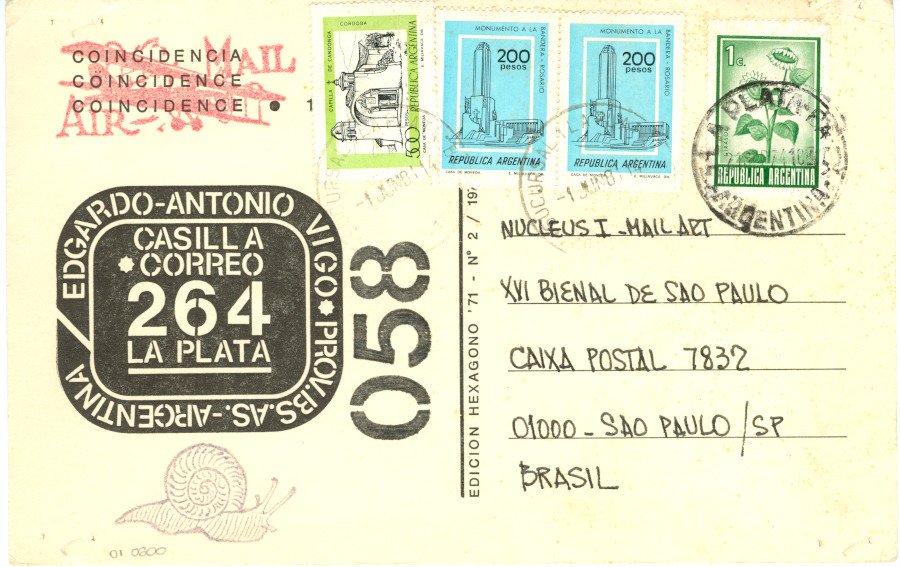 21 SET 1974 Voltar Documento 01.0600 Baixar Anexos 01.0600v Metadados Miniatura Compartilhe ArtistaEdgardo Antonio VigoNomeEdgardo Antonio VigoPaís de origemArgentinaDestinatárioNUCLEUS I - MAIL ART - XVI BIENAL DE SAO PAULO - CAIXA POSTAL 7832 - 01000 - SAO PAULO / SP - BRASIL.Título21 SET 1974Data1981Descrição de técnicaOffset, carimbo e caneta hidrográfica sobre papelTécnicaOffset, carimbo e caneta hidrográficaSuportesobre papelDimensões12,0 x 18,9 cmCategoriaArte PostalSubcategoriacartão postalPalavras-chaveCarimboNº de tombo01.0600ColeçãoXVI Bienal de São PauloProcedênciaFundação Bienal de São PauloModo de aquisiçãoDoaçãoAno de aquisição1984MídiaSim Continuar navegando International book Nº 3 5 4 3 2 Voltar para a lista de itens
