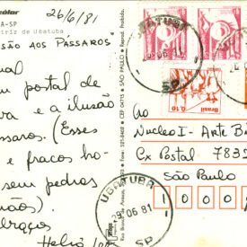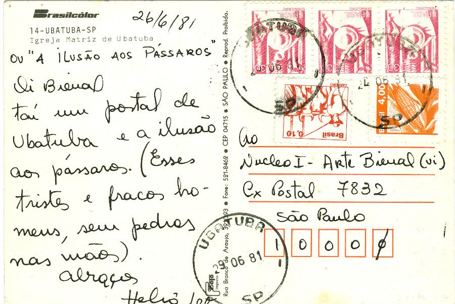 A ILUSÃO AOS PÁSSAROS Voltar Documento 01.0910 Baixar Anexos 01.0910v Metadados Miniatura Compartilhe ArtistaHélio LeteNomeHélio LetePaís de origemBrasilDestinatárioNucleo I - Arte Bienal (vi) - Cx Postal 7832 - São Paulo - 1000TítuloA ILUSÃO AOS PÁSSAROSData1981Descrição de técnicaOffset, caneta hidrográfica e fotocópia sobre papelTécnicaOffset, caneta hidrográfica e fotocópiaSuportesobre papelDimensões10,5 x 15,0 cmCategoriaArte PostalSubcategoriacartão postalPalavras-chaveFrase | Intervenção artística | Pássaro | TextoNº de tombo01.0910ColeçãoXVI Bienal de São PauloProcedênciaFundação Bienal de São PauloModo de aquisiçãoDoaçãoAno de aquisição1984MídiaSim Continuar navegando Sem título Sem título Voltar para a lista de itens