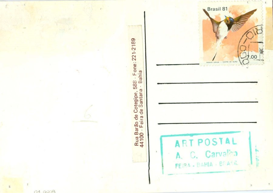 ARTE CORREIO DE A. C. CARVALHO Voltar Documento 01.0009 Baixar Anexos 01.0009v Metadados Miniatura Compartilhe ArtistaA. C. CarvalhoNomeAmador de Carvalho PerezPaís de origemBrasilDestinatárioNão possuiTítuloARTE CORREIO DE A. C. CARVALHOData1981Descrição de técnicaColagem, fotografia e caneta hidrográfica sobre papelTécnicaColagem, fotografia e caneta hidrográficaSuportesobre papelDimensões11,4 x 16,5 cmCategoriaArte PostalSubcategoriacartão postalPalavras-chaveColagem | FotografiaNº de tombo01.0009ColeçãoXVI Bienal de São PauloProcedênciaFundação Bienal de São PauloModo de aquisiçãoDoaçãoAno de aquisição1984Fotografia / EdiçãoEmilio Carlos Jeronymo Dantas GonçalvesMídiaSim Continuar navegando ARTE POSTAL DE A. C. CARVALHO FOTO DO AUTOR EM AMBIENTE DE TRABALHO Voltar para a lista de itens