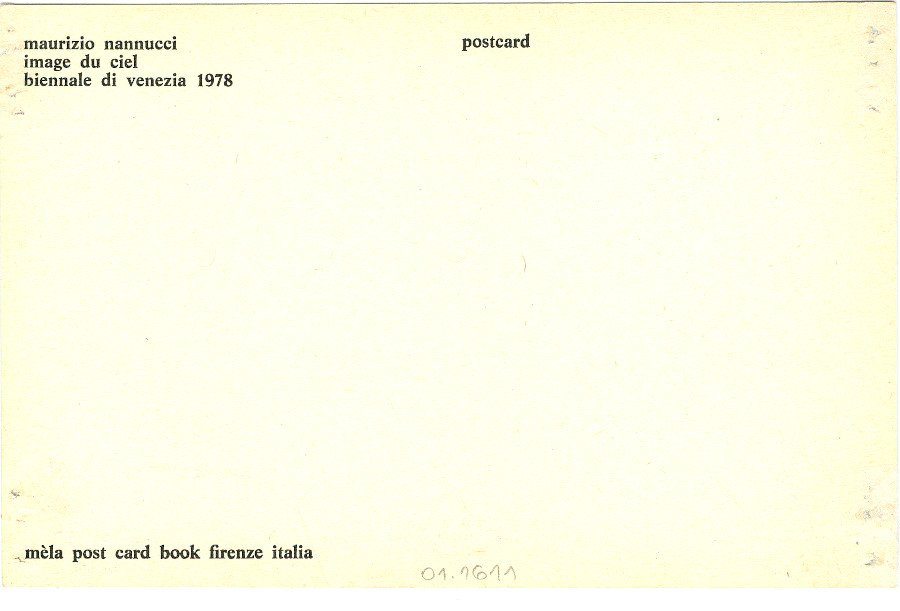 image du ciel Voltar Documento 01.16111 Baixar Anexos 01.1611v Metadados Miniatura Compartilhe ArtistaMaurizio NannucciNomeMaurizio NannucciPaís de origemItáliaDestinatárioNão possuiTítuloimage du cielData1978Descrição de técnicaOffset sobre papelTécnicaOffsetSuportesobre papelDimensões14,5 x 9,5 cmCategoriaArte PostalSubcategoriacartão postalPalavras-chaveFraseNº de tombo01.1611ColeçãoXVI Bienal de São PauloProcedênciaFundação Bienal de São PauloModo de aquisiçãoDoaçãoAno de aquisição1984MídiaSim Continuar navegando Sem título Sem título Voltar para a lista de itens