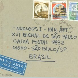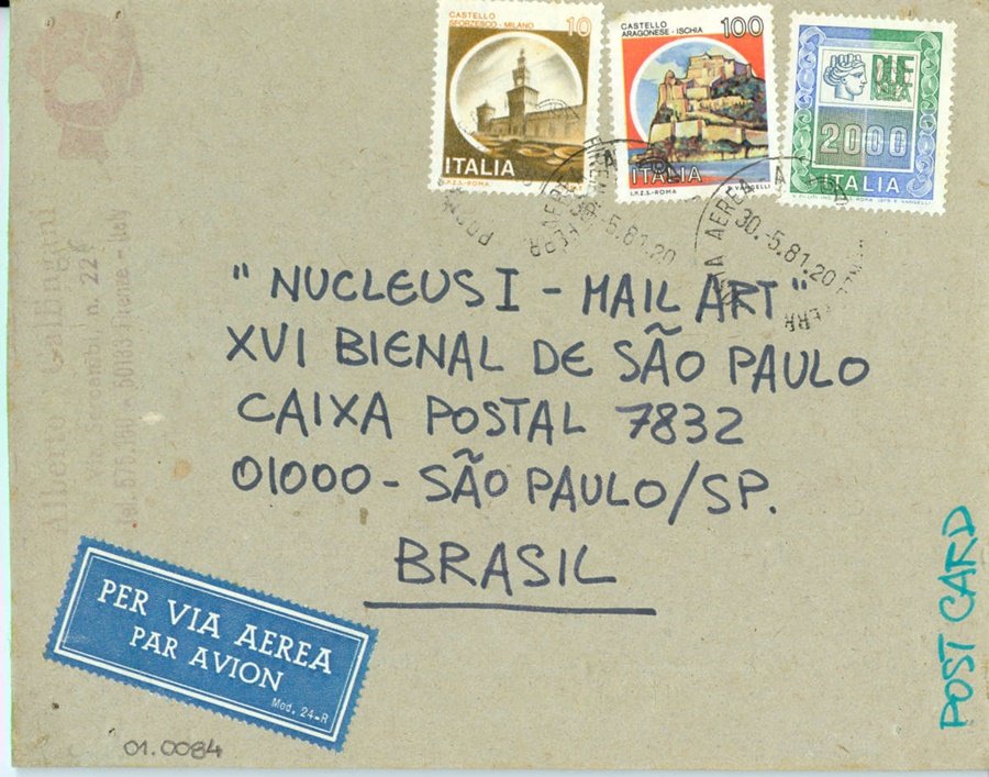 L’ARTE HA BISOGNO DI ESSERE VISSUTA Voltar Documento 01.0084 Baixar Anexos 01.0084v Metadados Miniatura Compartilhe ArtistaAlberto GallinganiNomeAlberto GallinganiPaís de origemItáliaDestinatárioNUCLEUS I - MAIL ART - XVI BIENAL DE SÃO PAULO - CAIXA POSTAL 7832 - 01000 - SÃO PAULO / SP. - BRASILTítuloL'ARTE HA BISOGNO DI ESSERE VISSUTAData1981Descrição de técnicaFotografia P/B, caneta hidrográfica e carimbo sobre papelTécnicaFotografia P/B, caneta hidrográfica e carimboSuportesobre papelDimensões11,9 x 15 cmCategoriaArte PostalSubcategoriacartão postalPalavras-chaveFotografiaNº de tombo01.0084ColeçãoXVI Bienal de São PauloProcedênciaFundação Bienal de São PauloModo de aquisiçãoDoaçãoAno de aquisição1984Fotografia / EdiçãoEmilio Carlos Jeronymo Dantas GonçalvesMídiaSim Continuar navegando L’ARTE HA BISOGNO DI ESSERE VISSUTA L’ARTE HA BISOGNO DI ESSERE VISSUTA Voltar para a lista de itens