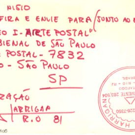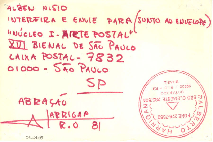 – NHOC… Voltar Documento 01.0106 Baixar Anexos 01.0106v Metadados Miniatura Compartilhe ArtistaAlberto HarriganNomeAlberto HarriganCoautorAlben Nisio FonsecaPaís de origemBrasilDestinatárioNÚCLEO I - ARTE POSTAL - XVI BIENAL DE SÃO PAULO - C. POSTAL 7832 - 01000 - SÃO PAULO - SPTítulo- NHOC...Data1981Descrição de técnicaFotocópia, caneta hidrográfica e carimbo sobre papelTécnicaFotocópia, caneta hidrográfica e carimboSuportesobre papelDimensões10,2 x 15,3 cmCategoriaArte PostalSubcategoriacartão postalPalavras-chaveCarimbo | Fotografia | Intervenção artística | PropostaNº de tombo01.0106ColeçãoXVI Bienal de São PauloProcedênciaFundação Bienal de São PauloModo de aquisiçãoDoaçãoAno de aquisição1984Fotografia / EdiçãoEmilio Carlos Jeronymo Dantas GonçalvesMídiaSim Continuar navegando – NHOC… – NHOC ……… Voltar para a lista de itens
