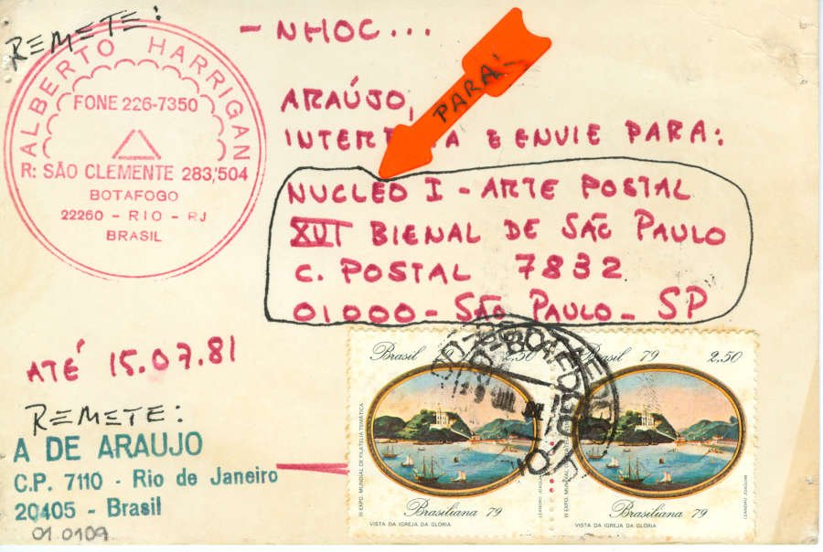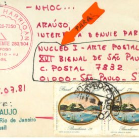 – NHOC… Voltar Documento 01.0109 Baixar Anexos 01.0109v Metadados Miniatura Compartilhe ArtistaAlberto HarriganNomeAlberto HarriganCoautorA. de AraujoPaís de origemBrasilDestinatárioNUCLEO I - ARTE POSTAL - XVI BIENAL DE SÃO PAULO - C. POSTAL 7832 - 01000 - SÃO PAULO - SPTítulo- NHOC...Data1981Descrição de técnicaFotocópia, carimbo, colagem, adesivo e caneta hidrográfica. sobre papelTécnicaFotocópia, carimbo, colagem, adesivo e caneta hidrográfica.Suportesobre papelDimensões15,3 x 10,1 cmCategoriaArte PostalSubcategoriacartão postalPalavras-chaveCarimbo | Fotografia | Intervenção artística | PropostaNº de tombo01.0109ColeçãoXVI Bienal de São PauloProcedênciaFundação Bienal de São PauloModo de aquisiçãoDoaçãoAno de aquisição1984Fotografia / EdiçãoEmilio Carlos Jeronymo Dantas GonçalvesMídiaSim Continuar navegando – NHOC… – NHOC… Voltar para a lista de itens