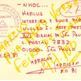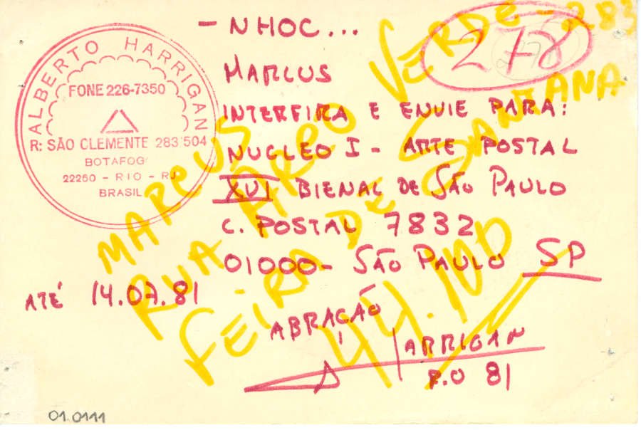 – NHOC… – GLUT… Voltar Documento 01.0111 Baixar Anexos 01.0111v Metadados Miniatura Compartilhe ArtistaAlberto HarriganNomeAlberto HarriganCoautorMarcus ZacariadesPaís de origemBrasilDestinatárioNUCLEO I - ARTE POSTAL - XVI BIENAL DE SÃO PAULO - C. POSTAL 7832 - 01000 - SÃO PAULO - SPTítulo- NHOC... - GLUT...Data1981Descrição de técnicaCaneta hidrográfica, carimbo, fotocópia e caneta esferográfica. sobre papelTécnicaCaneta hidrográfica, carimbo, fotocópia e caneta esferográfica.Suportesobre papelDimensões15,2 x 10,1 cmCategoriaArte PostalSubcategoriacartão postalPalavras-chaveCarimbo | Fotografia | Intervenção artística | PropostaNº de tombo01.0111ColeçãoXVI Bienal de São PauloProcedênciaFundação Bienal de São PauloModo de aquisiçãoDoaçãoAno de aquisição1984Fotografia / EdiçãoEmilio Carlos Jeronymo Dantas GonçalvesMídiaSim Continuar navegando – NHOC… – NHOC … Voltar para a lista de itens