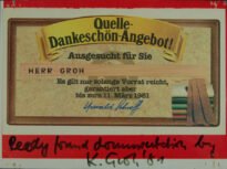 Quelle-Dankeschön-Angebot! Voltar Documento 01.1353 Baixar Metadados Miniatura Compartilhe ArtistaKlaus GrohNomeKlaus GrohPaís de origemNão identificadoDestinatárioNão possuiTítuloQuelle-Dankeschön-Angebot!Data1981Descrição de técnicaOffset e caneta hidrográfica sobre papelTécnicaOffset e caneta hidrográficaSuportesobre papelDimensões13,8 x 18,5 cmCategoriaArte PostalSubcategorianão identificadaPalavras-chaveFraseNº de tombo01.1353ColeçãoXVI Bienal de São PauloProcedênciaFundação Bienal de São PauloModo de aquisiçãoDoaçãoAno de aquisição1984MídiaSim Continuar navegando Sem título Sem título Voltar para a lista de itens