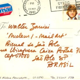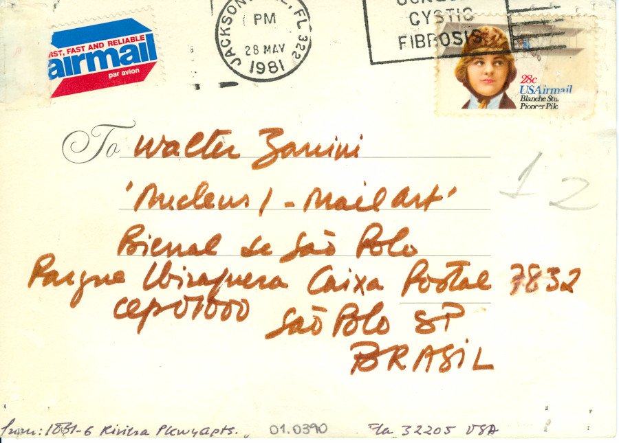 Sem título Voltar Documento 01.0390 Baixar Anexos 01.0390v Metadados Miniatura Compartilhe ArtistaClaude PelieuNomeClaude Pelieu-WashburnPaís de origemEstados UnidosDestinatárioWalter Zanini - 'Nucleus I - Mail Art' - Bienal de São Polo - Parque Ibirapuera - Caixa Postal 7832 - cep 01000 - São Polo - SP - BRASIL.TítuloSem títuloData1981Descrição de técnicaOffset, colagem, adesivo e caneta hidrográfica sobre papelTécnicaOffset, colagem, adesivo e caneta hidrográficaSuportesobre papelDimensões10,7 x 15,2 cmCategoriaArte PostalSubcategoriacartão postalPalavras-chaveAdesivo | Colagem | ObjetoNº de tombo01.0390ColeçãoXVI Bienal de São PauloProcedênciaFundação Bienal de São PauloModo de aquisiçãoDoaçãoAno de aquisição1984MídiaSim Continuar navegando Sem título Sem título Voltar para a lista de itens