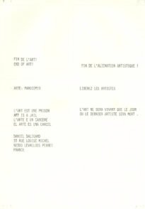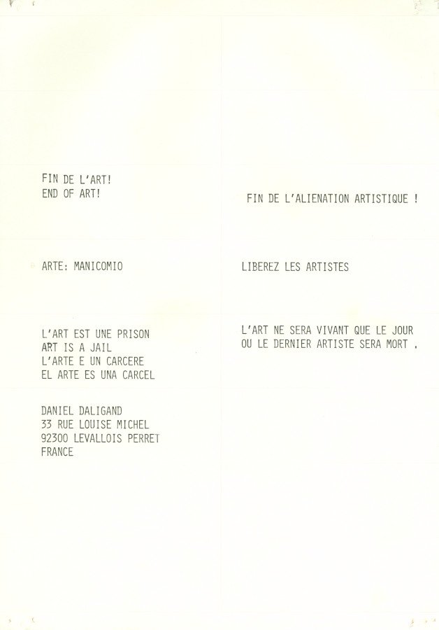 Sem título Voltar Documento 01.0502 Baixar Metadados Miniatura Compartilhe ArtistaDaniel DaligandNomeDaniel DaligandPaís de origemFrançaDestinatárioNão possuiTítuloSem títuloDataSem dataDescrição de técnicaImpressão não identificada sobre papelTécnicaImpressão não identificadaSuportesobre papelDimensões29,6 x 21,0 cmCategoriaArte PostalSubcategoriaadesivoPalavras-chaveAdesivo | Crítica | Frase | TextoNº de tombo01.0502ColeçãoXVI Bienal de São PauloProcedênciaFundação Bienal de São PauloModo de aquisiçãoDoaçãoAno de aquisição1984MídiaSim Continuar navegando Sem título MAIL OBJECT Project Voltar para a lista de itens