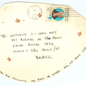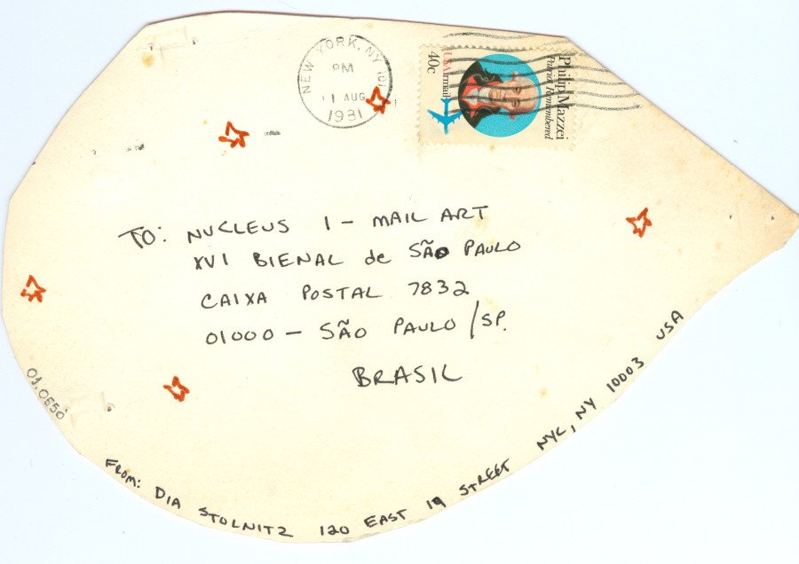 Sem título Voltar Documento 01.0550 Baixar Anexos 01.0550v Metadados Miniatura Compartilhe ArtistaDia StolnitzNomeDia StolnitzPaís de origemEstados UnidosDestinatárioNUCLEUS I - MAIL ART - XVI BIENAL de SÃO PAULO - CAIXA POSTAL 7832 - 01000 - São Paulo / SP. - BRASIL.TítuloSem títuloData1981Descrição de técnicaCaneta hidrográfica, cantoneira e aquarela sobre papelTécnicaCaneta hidrográfica, cantoneira e aquarelaSuportesobre papelDimensões13,2 x 20,3 cmCategoriaArte PostalSubcategoriacartão postalPalavras-chaveArco-íris | DesenhoNº de tombo01.0550ColeçãoXVI Bienal de São PauloProcedênciaFundação Bienal de São PauloModo de aquisiçãoDoaçãoAno de aquisição1984MídiaSim Continuar navegando MAIL ART ’81 30 muchachas con redes Voltar para a lista de itens