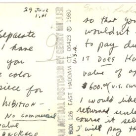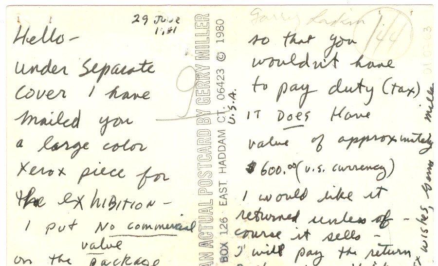 Sem título Voltar Documento 01.0763 Baixar Anexos 01.0763v Metadados Miniatura Compartilhe ArtistaGerry MillerNomeGerry MillerPaís de origemEstados UnidosDestinatárioNão possuiTítuloSem títuloData1981Descrição de técnicaFotocópia colorida, offset, grafite e caneta hidrográfica. sobre papelTécnicaFotocópia colorida, offset, grafite e caneta hidrográfica.Suportesobre papelDimensões9,0 x 14,1 cmCategoriaArte PostalSubcategoriacartão postalPalavras-chaveCartão Postal | Colagem | FotocópiaNº de tombo01.0763ColeçãoXVI Bienal de São PauloProcedênciaFundação Bienal de São PauloModo de aquisiçãoDoaçãoAno de aquisição1984MídiaSim Continuar navegando Sem título L’ArTE Non ci ToCcA Voltar para a lista de itens