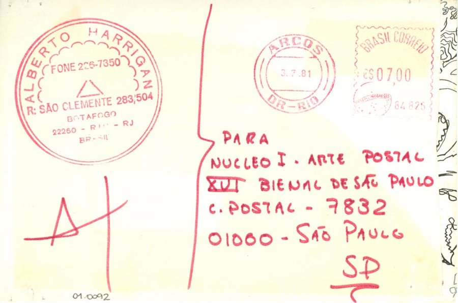 Sem título Voltar Documento 01.0092 Baixar Anexos 01.0092v Metadados Miniatura Compartilhe ArtistaAlberto HarriganNomeAlberto HarriganPaís de origemBrasilDestinatárioNUCLEO I - ARTE POSTAL - XVI BIENAL DE SÃO PAULO - C. POSTAL - 7832 01000 - SÃO PAULO - SPTítuloSem títuloData1981Descrição de técnicaCarimbo, caneta hidrográfica e fotocópia sobre papelTécnicaCarimbo, caneta hidrográfica e fotocópiaSuportesobre papelDimensões10,2 x 15,3 cmCategoriaArte PostalSubcategoriacartão postalPalavras-chaveCarimboNº de tombo01.0092ColeçãoXVI Bienal de São PauloProcedênciaFundação Bienal de São PauloModo de aquisiçãoDoaçãoAno de aquisição1984Fotografia / EdiçãoEmilio Carlos Jeronymo Dantas GonçalvesMídiaSim Continuar navegando Sem título Sem título Voltar para a lista de itens