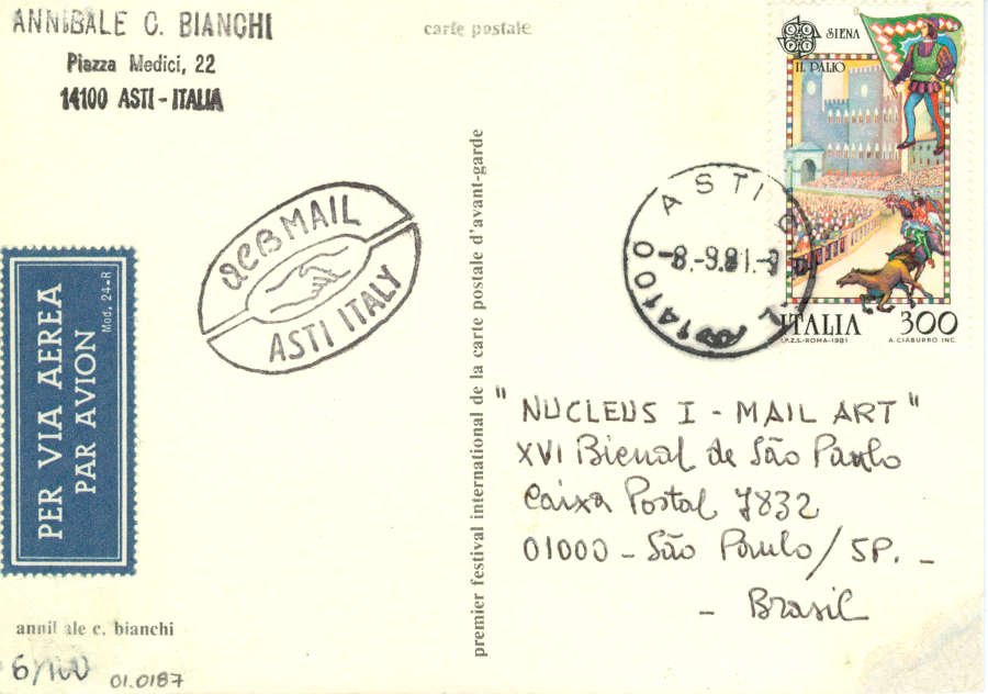 Sem título Voltar Documento 01.0187 Baixar Anexos 01.0187v Metadados Miniatura Compartilhe ArtistaAnnibale Carlo BianchiNomeAnnibale Carlo BianchiPaís de origemItáliaDestinatárioNUCLEUS I - MAIL ART - XVI Bienal de São Paulo - Caixa Postal 7832 - 01000 - São Paulo/SP. - BrasilTítuloSem títuloData1981Descrição de técnicaOffset, serigrafia, caneta esferográfica e carimbo sobre papelTécnicaOffset, serigrafia, caneta esferográfica e carimboSuportesobre papelDimensões10,2 x 14,5 cmCategoriaArte PostalSubcategoriacartão postalPalavras-chaveCarimboNº de tombo01.0187ColeçãoXVI Bienal de São PauloProcedênciaFundação Bienal de São PauloModo de aquisiçãoDoaçãoAno de aquisição1984Fotografia / EdiçãoEmilio Carlos Jeronymo Dantas GonçalvesMídiaSim Continuar navegando …e Sem título Voltar para a lista de itens