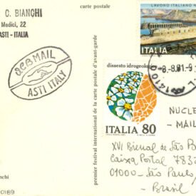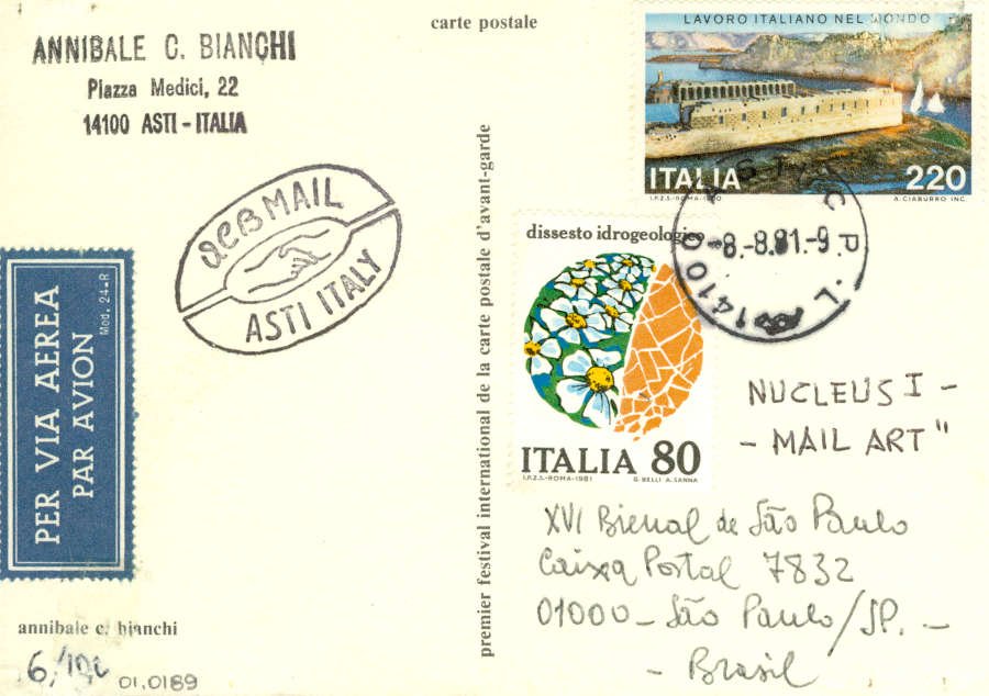 Sem título Voltar Documento 01.0189 Baixar Anexos 01.0189v Metadados Miniatura Compartilhe ArtistaAnnibale Carlo BianchiNomeAnnibale Carlo BianchiPaís de origemItáliaDestinatárioNUCLEUS I - MAIL ART - XVI Bienal de São Paulo - Caixa Postal 7832 - 01000 - São Paulo/SP. - BrasilTítuloSem títuloData1981Descrição de técnicaOffset, serigrafia, caneta esferográfica e carimbo sobre papelTécnicaOffset, serigrafia, caneta esferográfica e carimboSuportesobre papelDimensões10,2 x 14,5 cmCategoriaArte PostalSubcategoriacartão postalPalavras-chaveCarimboNº de tombo01.0189ColeçãoXVI Bienal de São PauloProcedênciaFundação Bienal de São PauloModo de aquisiçãoDoaçãoAno de aquisição1984Fotografia / EdiçãoEmilio Carlos Jeronymo Dantas GonçalvesMídiaSim Continuar navegando Sem título Sem título Voltar para a lista de itens