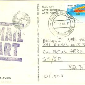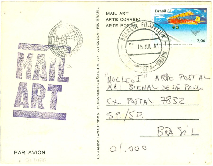 Sem título Voltar Documento 01.2468 Baixar Anexos 01.2468v Metadados Miniatura Compartilhe ArtistaUnhandeijara LisboaNomeUnhandeijara LisboaPaís de origemBrasilDestinatárioNUCLEO I - ARTE POSTAL - XVI BIENAL DE SÃO PAULO - CAIXA POSTAL 7832 - SP./SP - BRASIL - 01.000TítuloSem títuloData1981Descrição de técnicaOffset, carimbo e caneta esferográfica sobre papelTécnicaoffset, carimbo e caneta esferográficaSuportesobre papelDimensões11,0 x 14,4 cmCategoriaArte PostalSubcategoriacartão postalPalavras-chaveCarimboNº de tombo01.2468ColeçãoXVI Bienal de São PauloProcedênciaFundação Bienal de São PauloModo de aquisiçãoDoaçãoAno de aquisição1984MídiaSim Continuar navegando SEMANA DA PÁTRIA Sem título Voltar para a lista de itens