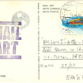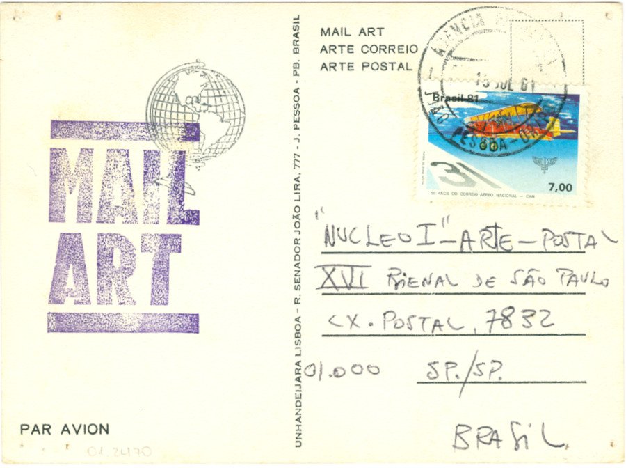 Sem título Voltar Documento 01.2470 Baixar Anexos 01.2470v Metadados Miniatura Compartilhe ArtistaUnhandeijara LisboaNomeUnhandeijara LisboaPaís de origemBrasilDestinatárioNUCLEO I - ARTE POSTAL - XVI BIENAL DE SÃO PAULO - CAIXA POSTAL 7832 - 01.000 - SP./SP - BRASILTítuloSem títuloData1981Descrição de técnicaOffset, carimbo e caneta esferográfica sobre papelTécnicaoffset, carimbo e caneta esferográficaSuportesobre papelDimensões10,9 x 14,9 cmCategoriaArte PostalSubcategoriacartão postalPalavras-chaveCarimboNº de tombo01.2470ColeçãoXVI Bienal de São PauloProcedênciaFundação Bienal de São PauloModo de aquisiçãoDoaçãoAno de aquisição1984MídiaSim Continuar navegando Sem título Sem título Voltar para a lista de itens