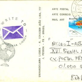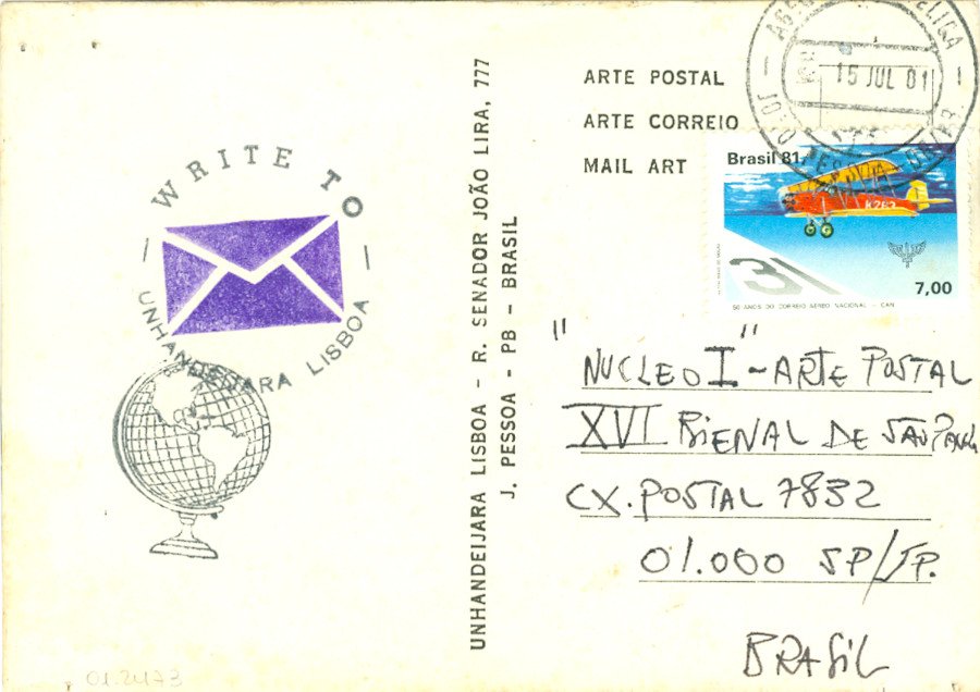 Sem título Voltar Documento 01.2473 Baixar Anexos 01.2473v Metadados Miniatura Compartilhe ArtistaUnhandeijara LisboaNomeUnhandeijara LisboaPaís de origemBrasilDestinatárioNUCLEO I - ARTE POSTAL - XVI BIENAL DE SÃO PAULO - CX. POSTAL 7832 - 01.000 - SP./SP - BRASILTítuloSem títuloData1981Descrição de técnicaOffset, carimbo e caneta hidrográfica sobre papelTécnicaOffset, carimbo e caneta hidrográficaSuportesobre papelDimensões10,6 x 15,1 cmCategoriaArte PostalSubcategoriacartão postalPalavras-chaveCarimboNº de tombo01.2473ColeçãoXVI Bienal de São PauloProcedênciaFundação Bienal de São PauloModo de aquisiçãoDoaçãoAno de aquisição1984MídiaSim Continuar navegando Sem título Sem título Voltar para a lista de itens