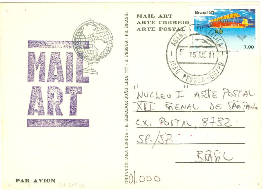 Sem título Voltar Documento 01.2476 Baixar Anexos 01.2476v Metadados Miniatura Compartilhe ArtistaUnhandeijara LisboaNomeUnhandeijara LisboaPaís de origemBrasilDestinatárioNÚCLEO I - ARTE POSTAL - XVI BIENAL DE SÃO PAULO - CAIXA, 8732 - SP./SP - BRASIL - 01.000TítuloSem títuloData1981Descrição de técnicaCarimbo, offset e caneta esferográfica sobre papelTécnicaCarimbo, offset e caneta esferográficaSuportesobre papelDimensões15,2 x 10,9 cmCategoriaArte PostalSubcategoriacartão postalPalavras-chaveCarimboNº de tombo01.2476ColeçãoXVI Bienal de São PauloProcedênciaFundação Bienal de São PauloModo de aquisiçãoDoaçãoAno de aquisição1984MídiaSim Continuar navegando Sem título IMPRESSÃO DA MÃO DE TAUXAB Voltar para a lista de itens