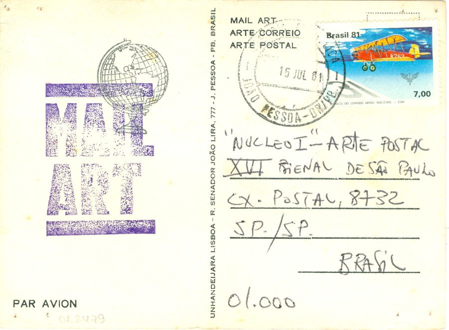 Sem título Voltar Documento 01.2479 Baixar Anexos 01.2479v Metadados Miniatura Compartilhe ArtistaUnhandeijara LisboaNomeUnhandeijara LisboaPaís de origemBrasilDestinatárioNÚCLEO I - ARTE POSTAL - XVI BIENAL DE SÃO PAULO - CAIXA, 8732 - SP./SP - BRASIL - 01.000TítuloSem títuloData1981Descrição de técnicaOffset, colagem, carimbo e caneta esferográfica sobre papelTécnicaOffset, colagem, carimbo e caneta esferográficaSuportesobre papelDimensões10,9 x 14,9 cmCategoriaArte PostalSubcategoriacartão postalPalavras-chaveCarimboNº de tombo01.2479ColeçãoXVI Bienal de São PauloProcedênciaFundação Bienal de São PauloModo de aquisiçãoDoaçãoAno de aquisição1984MídiaSim Continuar navegando Sem título Sem título Voltar para a lista de itens