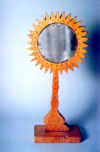UM ESPELHO CIRCULAR ENCAIXADO NUM QUADRO TAMBEM CIRCULAR DENTADO E SUPORTADO POR UMA COLUNA DESENHADA IRREGULARMENTE. A MADEIRA DO QUADRO E DA COLUNA (MARFIM) APRESENTA VESTIGIOS DE INCRUSTAÇÕES EM TODA A SUA EXTENSÃO. NA PARTE DO QUADRO AINDA RESTAM ALGUNS CRISTÁIS INCRUSTADOS. NA BASE DA COLUNA - SUPORTE APARECEM AS INICIAIS O.F.M. GRAVADAS EM BAIXO RELEVO QUE SIGNIFICAM: OXUM FÁ MILÓ
