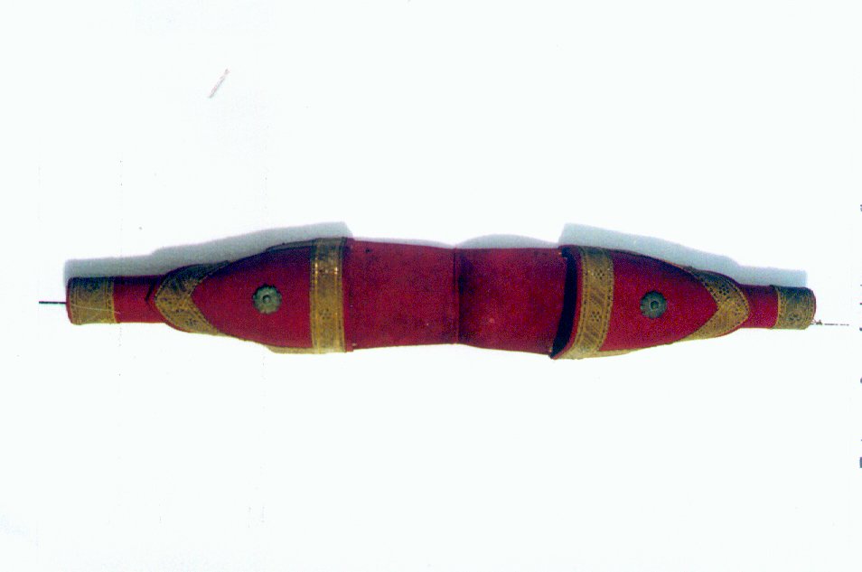 TIRA DE COURO. TENDO NAS EXTREMIDADES BOLSAS CÔNICAS, TAMBEM DE COURO, ONDE SÃO COLOCADAS AS GARRUCHAS. TODA COBERTA DE PANO VERMELHO, É GUARNECIDA DE GALÕES DOURADOS E PLACAS DE METAL EM FORMA DE FLOR. AS GUARRUCHEIRAS DOS CAVALEIROS CRISTÃOS SÃO PRETAS COM GALÕES PRATEADOS