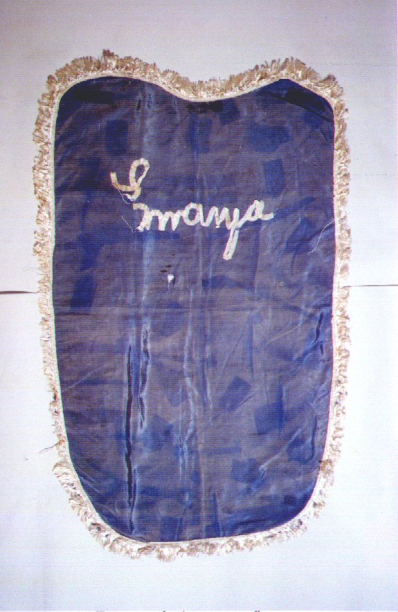 PANO PARA COBRIR FETICHES Voltar Documento n484 Baixar Metadados Miniatura Compartilhe DescriçãoPANO DE SEDA VEGETAL, AZUL, COM FRANJA BRANCA DO MESMO MATERIAL. FÓRMA OVALADA, APLICADA EM FITA BRANCA, A PALAVRA ""EMANJÁ""TítuloPANO PARA COBRIR FETICHESTipo de documentoobjetoLocalRECIFE (PE)DataFEVEREIRO A JULHO DE 1938FabricaçãoNÃO INDICADA.Utilização2- XANGÔ TERREIRO DE APOLINÁRIO. 5- PARA COBRIR O ""ASSENTO DO ORIXÁ IEMANJÁ.ColhedorMISSÃO DE PESQUISAS FOLCLÓRICASMídiasimCódigo / TomboOBJ484Dimensões / Duração76 CM X 46 CM Continuar navegando PANO PARA COBRIR FETICHES PANO PARA COBRIR FETICHES Voltar para a lista de itens