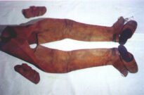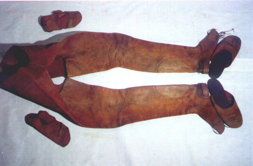 VESTUÁRIO COMPOSTO DE SEIS PEÇAS: CHAPÉU DE COURO DE BOI. (""OS PENDENTES SÃO CORREIAS DE BABI CASTÚ"" (?)). LUVAS DE COURO DE BÓDE (MÔO-ZÁ). ""AS FIVELAS SÃO A TÓCA DE LUVAS"". CHINELAS DE COURO DE BODE. (""UMA PARTE PARA OS PÉS DO VAQUEIRO""); GUARDA-PEITO DE COURO DE VEADO. (""OS PENDENTES SÃO GUARDA-PUNHOS""). GIBÃO DE COURO DE VEADO. (""OS PENDENTES SÃO ATACADEIRAS PARA ATACAR O GIBÃO; TEM DOIS BOLSOS COM TAMPA""). PERNEIRA DE COURO DE VEADO. (""A PARTE DE BAIXO CHAM-SE COBRE-PÉ E OS PENDENTES SÃO ATACADEIRAS DA CHINELA; A PARTE DE CIMA TEM O CINTO COM FIVELA E A COSTURA"")
