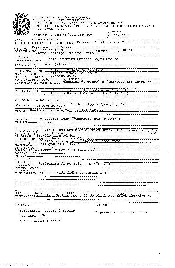 Registro do espetáculo do Balé da Cidade de São Paulo composto pelas coreografias Carnaval dos Animais e Máscaras do Tempo apresentado no Teatro Municipal de São Paulo. Direção...