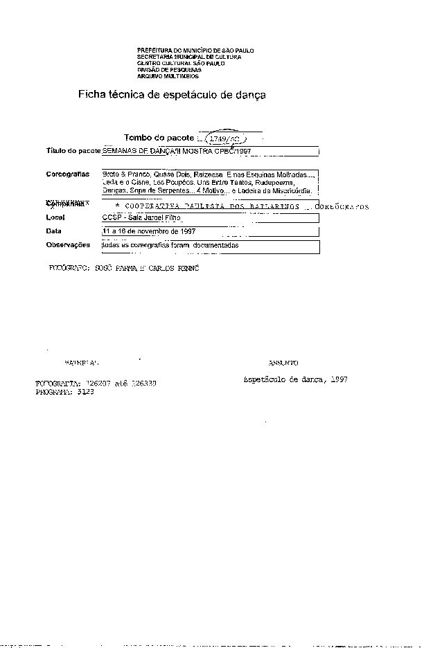 Coreografias: Cortejo, Ações, Ponto Final da Última Cena, Do Lado de Lá, Um Outro Corpo, O Homem de Pé por Curiosidade, Um Campo em Preto e Branco.