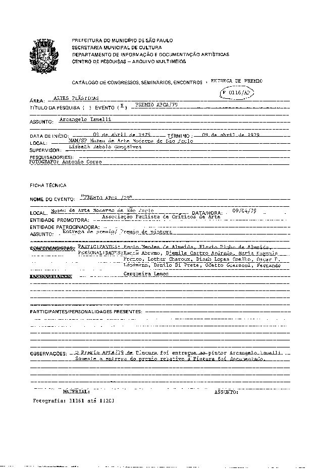 Registro da entrega do Prêmio APCA/1979 – Pintura a Arcângelo Ianelli no Museu de Arte Moderna-SP.