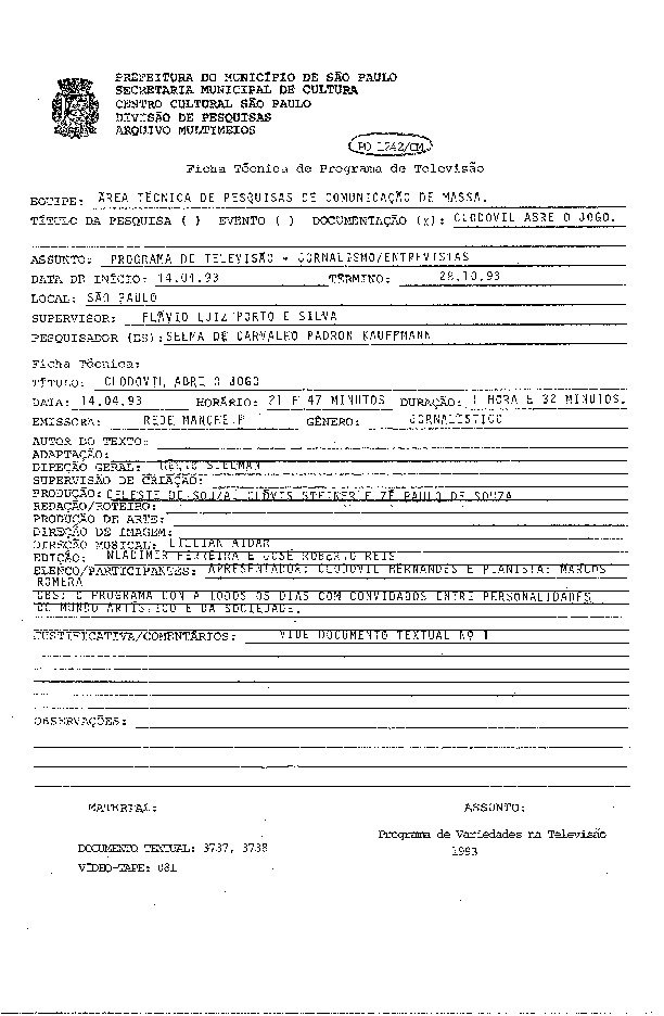 23/08/2022 by Francisco da Silva Santos Leia Mais...Registro do programa apresentado por Clodovil Hernandes levado ao ar pela Central Nacional de Televisão.