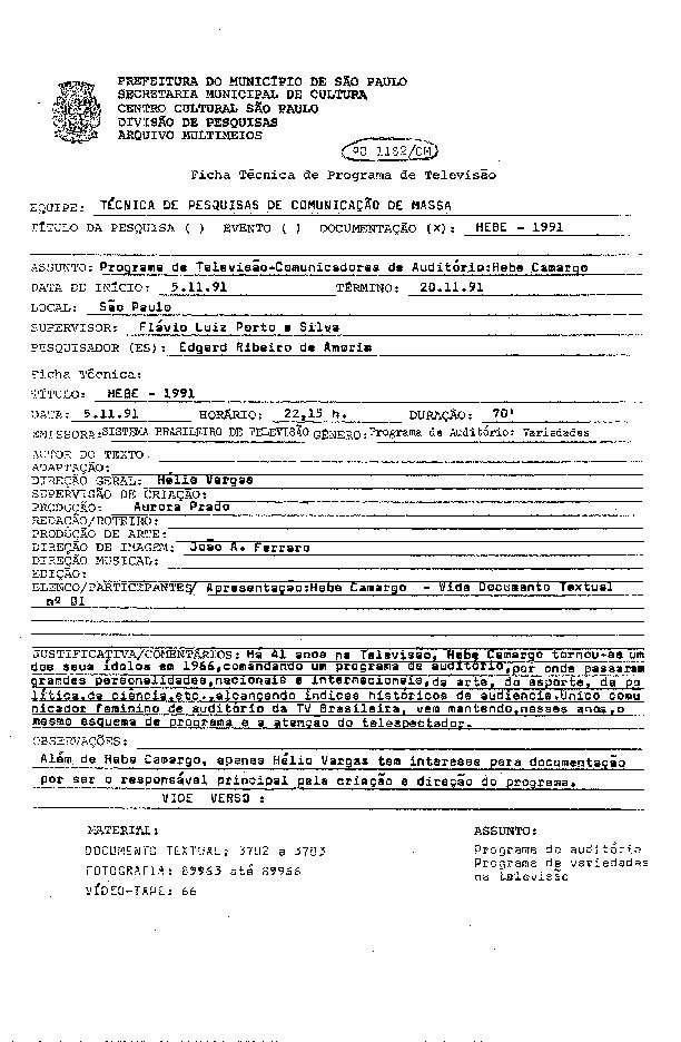 23/08/2022 by Francisco da Silva Santos Leia Mais...Registro do programa de variedades na televisão apresentado por Hebe Camargo levado ao ar pelo Sistema Brasileiro de Televisão – SBT.