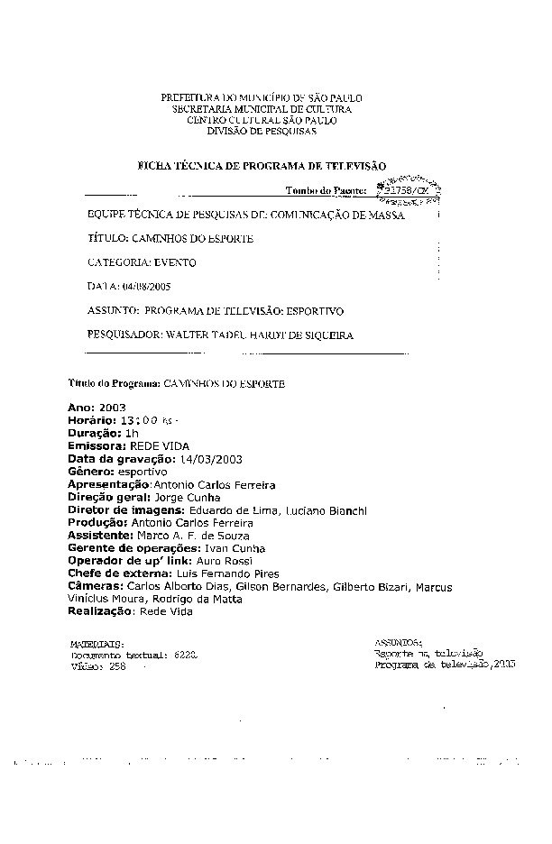 23/08/2022 by Francisco da Silva Santos Leia Mais...Registro do programa apresentado por Antonio Carlos Ferreira, levado ao ar pela Rede Vida.