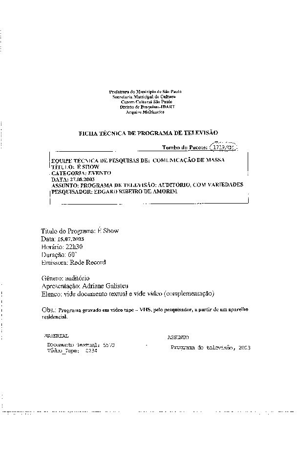 23/08/2022 by Francisco da Silva Santos Leia Mais...Registro do programa, levado ao ar pela Rede Record.
